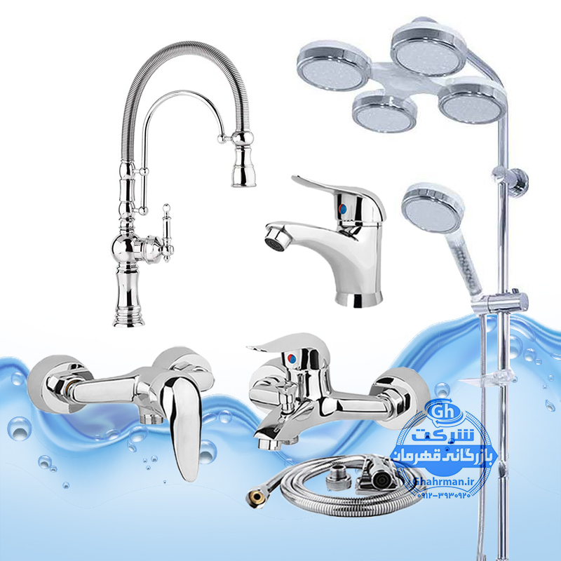 ست ۶ عددی شیرآلات برند آیدا صنعت مدل قهرمان | شیر ظرفشویی بیزانس تکمنظوره + روشویی + حمام + توالت + علم دوش هلی شاتی + شلنگ توالت | کروم براق۱۰۰٬۰۰۰٬۰۰۰ تومان