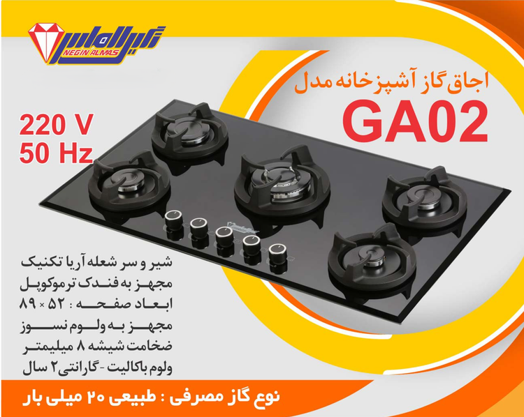 اجاق گاز صفحه شیشه ای نگین الماس کد GA02 ابعاد 89×52