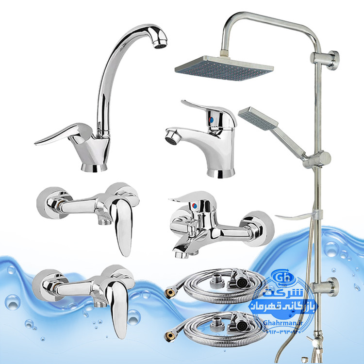 ست ۸ عددی شیرآلات برند آیدا صنعت مدل دنیز | شیر ظرفشویی + روشویی + حمام + دو عدد توالت + علم دوش یونیورست صفحه استیل رسوبگیر اتومات + دو شلنگ توالت | کروم براق