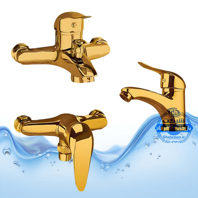 ست ۳ عددی شیرآلات برند آیدا صنعت مدل دنیز | شیر حمام + شیر توالت + شیر روشویی | طلایی براق