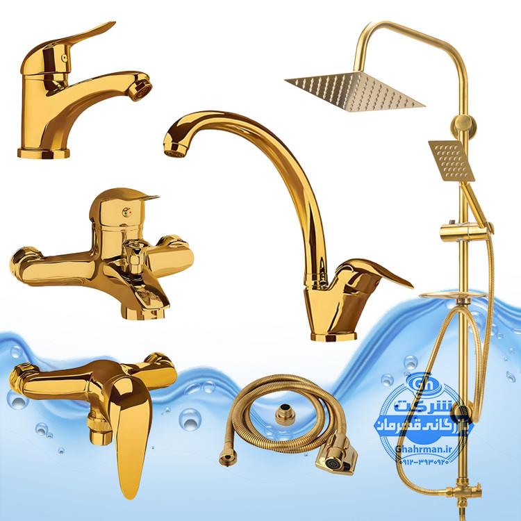 ست ۶ عددی شیرآلات مدل دنیز | شیر ظرفشویی + روشویی + حمام + توالت + شلنگ توالت + علم دوش صفحه استیل | طلایی براق