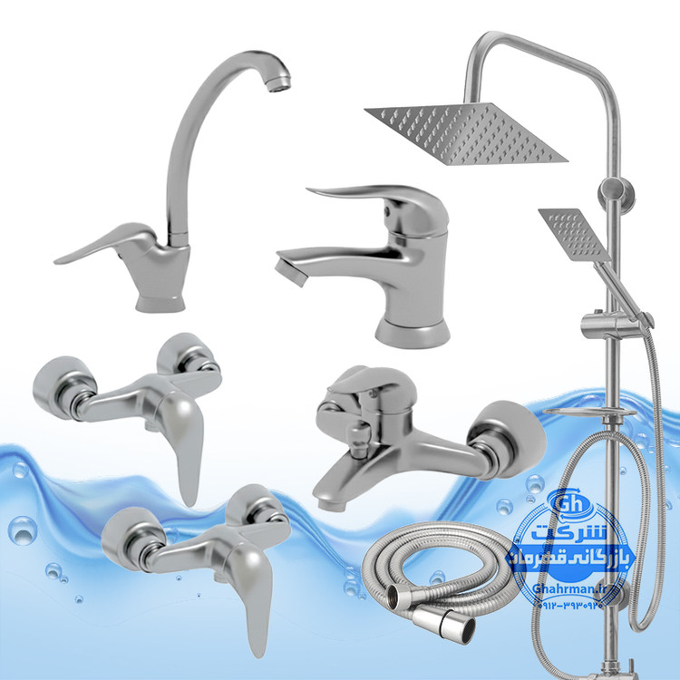 ست ۷ عددی شیرآلات برند آیدا صنعت مدل دنیز | شیر ظرفشویی + روشویی + حمام + توالت + علم دوش یونیورست صفحه استیل + شلنگ توالت | کروم مات
