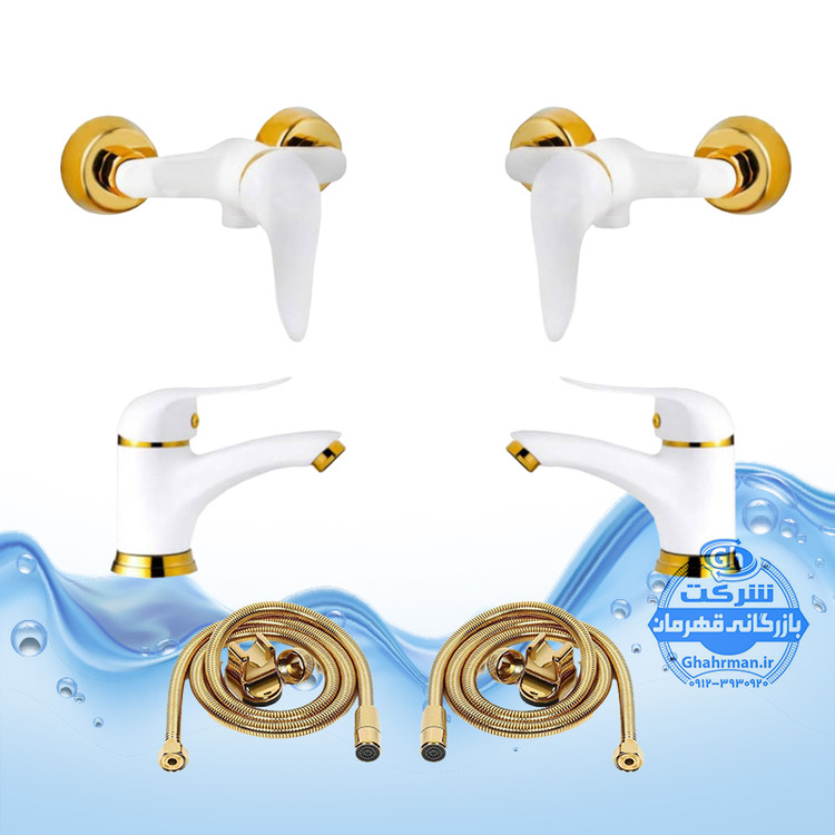 ست ۶ عددی شیرآلات مدل دنیز | ۲ عدد شیر روشویی + ۲ عدد شیر توالت + ۲ عدد شلنگ توالت | سفید طلایی