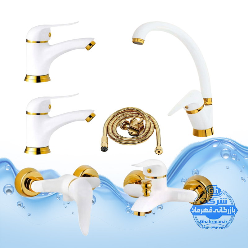 ست ۶ عددی شیرآلات مدل دنیز | شیر ظرفشویی + ۲ عدد روشویی + حمام + توالت + شلنگ توالت | سفید طلایی