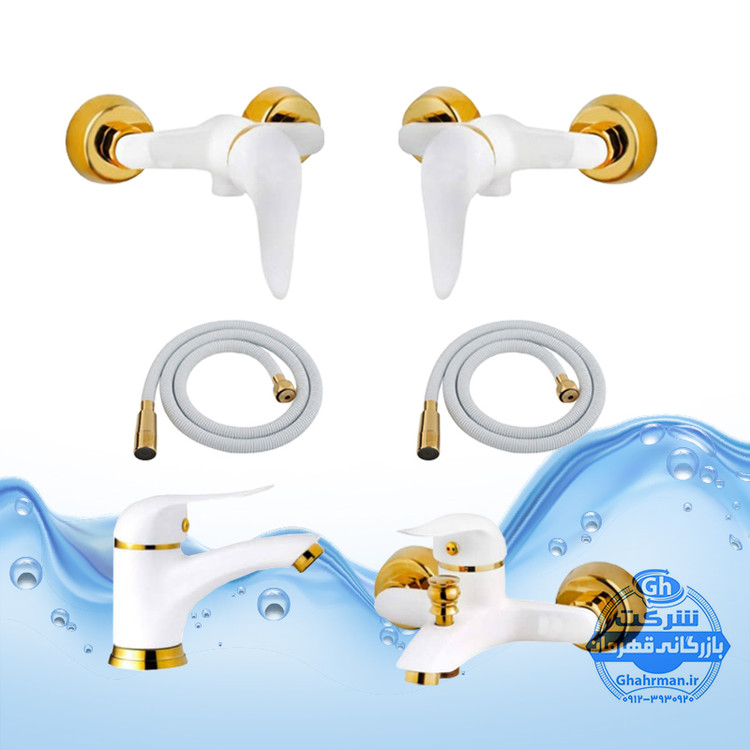 ست ۶ عددی شیرآلات مدل دنیز | ۲ عدد شیر توالت + ۲ عدد شلنگ توالت + شیر حمام + شیر روشویی | سفید طلایی