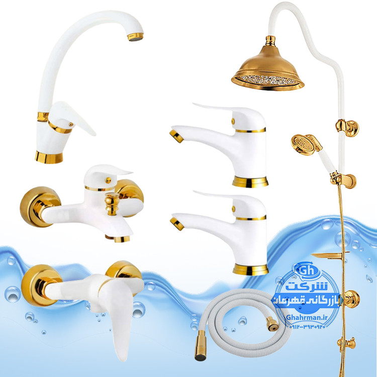 ست ۷ عددی شیرآلات برند آیدا صنعت مدل دنیز | شیر ظرفشویی + ۲ عدد روشویی + حمام + توالت + علم دوش شیپوری + شلنگ توالت | سفید طلایی