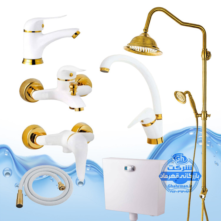 ست ۷ عددی شیرآلات برند آیدا صنعت مدل دنیز | سفید طلایی | همراه علم دوش شیپوری