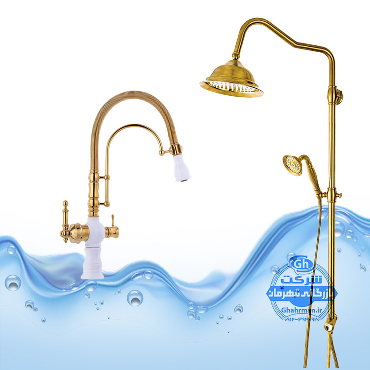 ست ۲ عددی شیر ظرفشویی مدل بیزانس دو منظوره و علم دوش یونیورست مدل شیپوری | سفید طلایی | شیرآلات برند آیدا صنعت مدل قهرمان