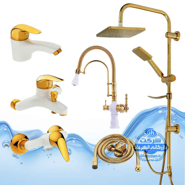 ست ۶ عددی شیرآلات مدل قهرمان | شیر ظرفشویی دومنظوره کلاسیک فنری بیزانس + شیر روشویی + حمام + توالت + شلنگ توالت + علم دوش اتومات مربع | سفید طلایی
