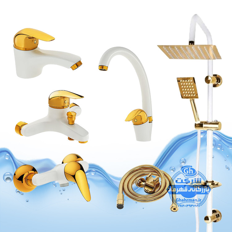 ست ۶ عددی شیرآلات مدل قهرمان | شیر ظرفشویی + روشویی + حمام + توالت + شلنگ توالت + علم دوش صفحه استیل | سفید طلایی