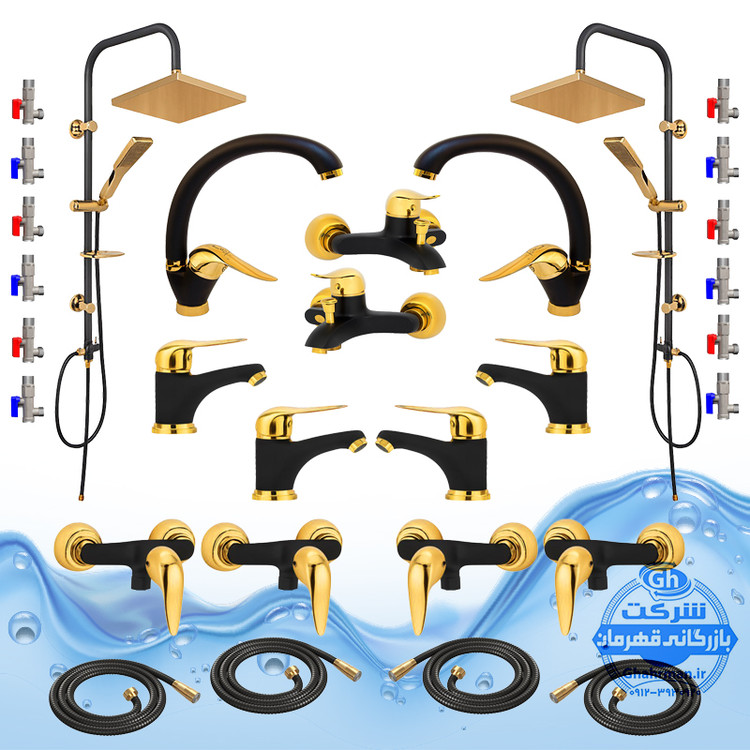 ست ۳۰ عددی شیرآلات برند آیدا صنعت مدل دنیز | سه عدد شیر ظرفشویی + سه عدد شیر روشویی + سه عدد شیر حمام + سه عدد شیر توالت + سه عدد علم دوش یونیورست مدل رسوب‌گیر + سه عدد شلنگ توالت + سه عدد شلنگ استیل + دوازده عدد شیر پیسوار | مشکی طلایی