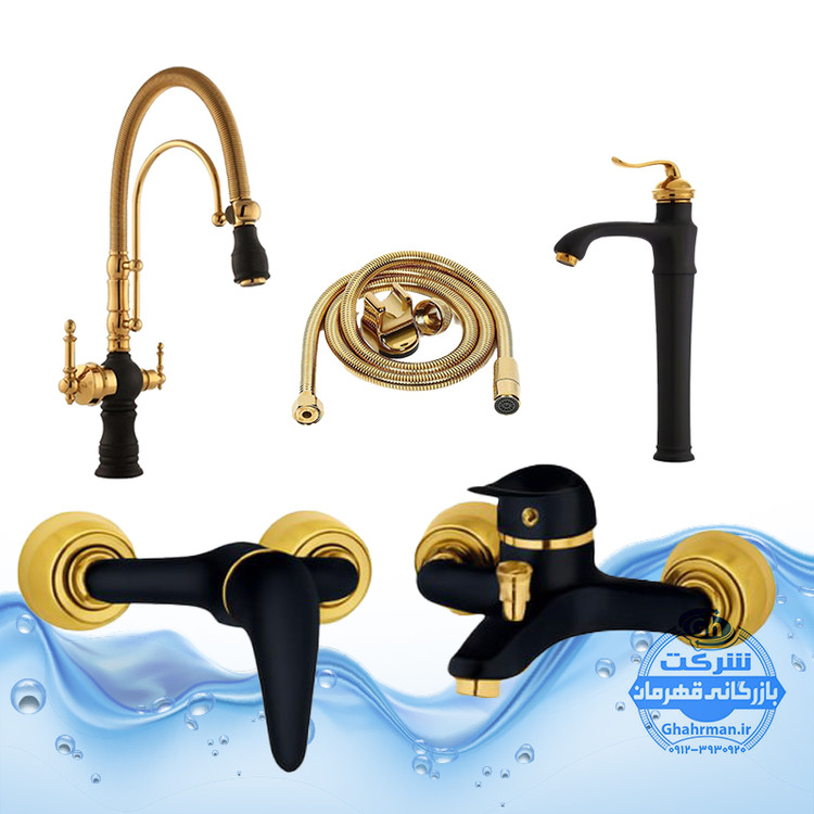 ست ۵ عددی شیرآلات برند آیدا صنعت مدل دنیز | شیر روشویی پایه‌بلند بامبو + شیر ظرفشویی بیزانس دومنظوره + شیر توالت + شیر حمام + شلنگ توالت | مشکی طلایی