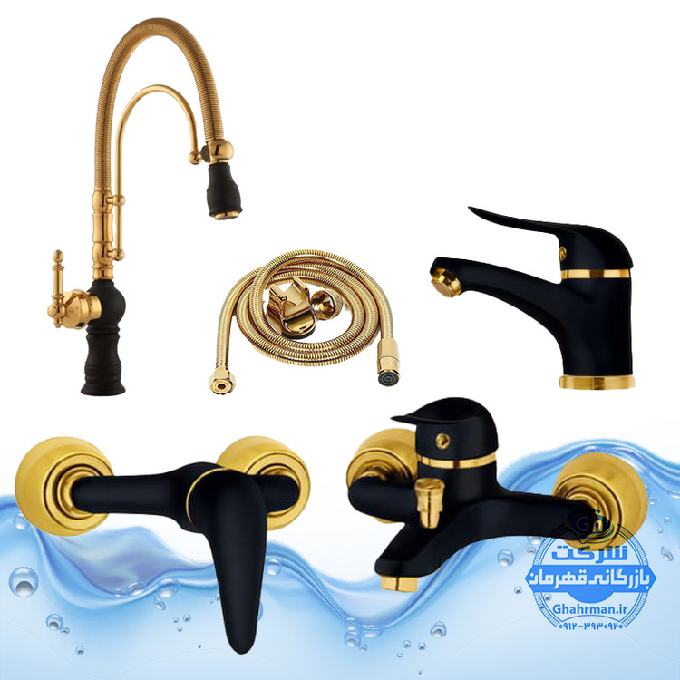 ست ۵ عددی شیرآلات برند آیدا صنعت مدل بیزانس و دنیز | شیر روشویی اهرمی + شیر ظرفشویی بیزانس تک‌منظوره + شیر حمام + شیر توالت + شلنگ توالت | مشکی طلایی